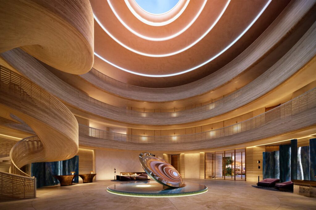 Positioned at the center of Triple Bay’s luxury marina—near the Yacht Club, the Corallium Marine Life Institute, retail, and dining—the resort is developed as a sculptural focal point within the waterfront district. The architecture engages directly with the marina while framing views of the Red Sea and the Hijaz Mountains.