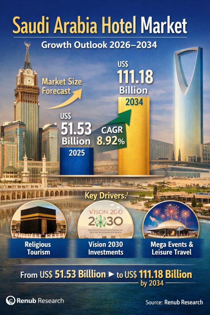 According to Renub Research, the Saudi Arabia Hotel Market is expected to reach US$ 111.18 billion by 2034, up from US$ 51.53 billion in 2025, growing at a CAGR of 8.92% from 2026 to 2034. This robust growth reflects not only rising visitor numbers but also the rapid expansion of hotel capacity, the entry of international chains, and the development of mega tourism projects across the Kingdom.